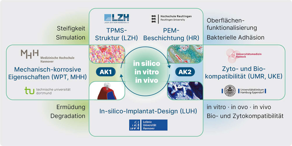 Die sieben Teilprojekte (TP) der For­schungs­gruppe lassen sich in zwei Forschungsschwerpunkte einteilen, die über interdisziplinäre Arbeitskreise (AK) abgebildet werden. Die AKs führen die Forschungsergebnisse aus den TPs zusammen und schaffen damit Synergien sowie einen kontinuierlichen Austausch zwischen den TPs. Dadurch können Innovationen insbesondere in den Schnittstellen zwischen den verschiedenen Disziplinen schnell und effektiv hervorgebracht werden.