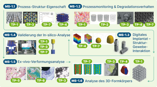 Arbeitskreis 1 (AK-1) zur „Adaptive Steifigkeit und Schädigungsmechanismen“ wird von Prof. Walther (TP-3, Sprecher) und Prof. Junker (TP-7) geleitet und fokussiert die wissenschaftlich basierte lokale Anpassung der Steifigkeit durch Kenntnis des quasi-statischen und zyklischen Verformungsverhaltens additiv gefertigter TPMS-Gitterstrukturen. Dabei wird ein mechanismenbasiertes Verständnis des Verformungs-, Schädigungs- und Degradationsverhaltens der Gitterstrukturen aufgebaut, um dieses mittels In-silico-Methoden zur lebensdauergerechten Implantatgestaltung nutzen zu können.